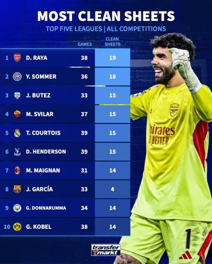 五大职业联赛 守门员中拉亚目前各项赛事19场零封第一, 索默18场第二