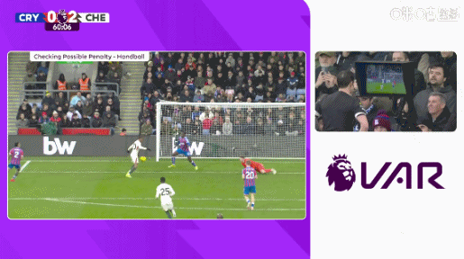 赛事 第59分钟,若昂·佩德罗危险区域 内射球 被水晶宫后场球员坎沃挡出,随后VAR介入,主裁判 观看视频回放后认为坎沃手球运动 违例 ,判给切尔西一个十二码球,并向坎沃出示了警告 。